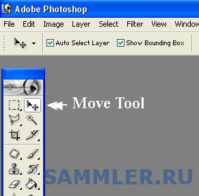 Потом: выбрав для работы (нажатием на иконку) Move Tool - Инструмент перемещения - (см. на рисунке) помещаем курсор на вторую картинку, нажимаем левую кнопку мыши, картинка прилипает к курсору и тащим ее (картинку) удерживая левую кнопку на мыши нажатой, через все рамки на основную, в то место, что уже подготовлено для перемещаемого изображения. При перемещении изображения виден только курсор, когда изображение переместится на основную картинку, на курсоре появляется знак плюс, курсор с плюсом ставим туда, где планируется центр перемещаемого изображения, отпускаем кнопку на мыши, появляется изображение и оно почти на месте. После этого можно для удобства основное изображение открыть полностью и нажав опять на левую кнопку мыши установить изображение более точно на нужное место, тонкая доводка (на уровне пикселей) может производиться курсорными клавишами на клавиатуре.