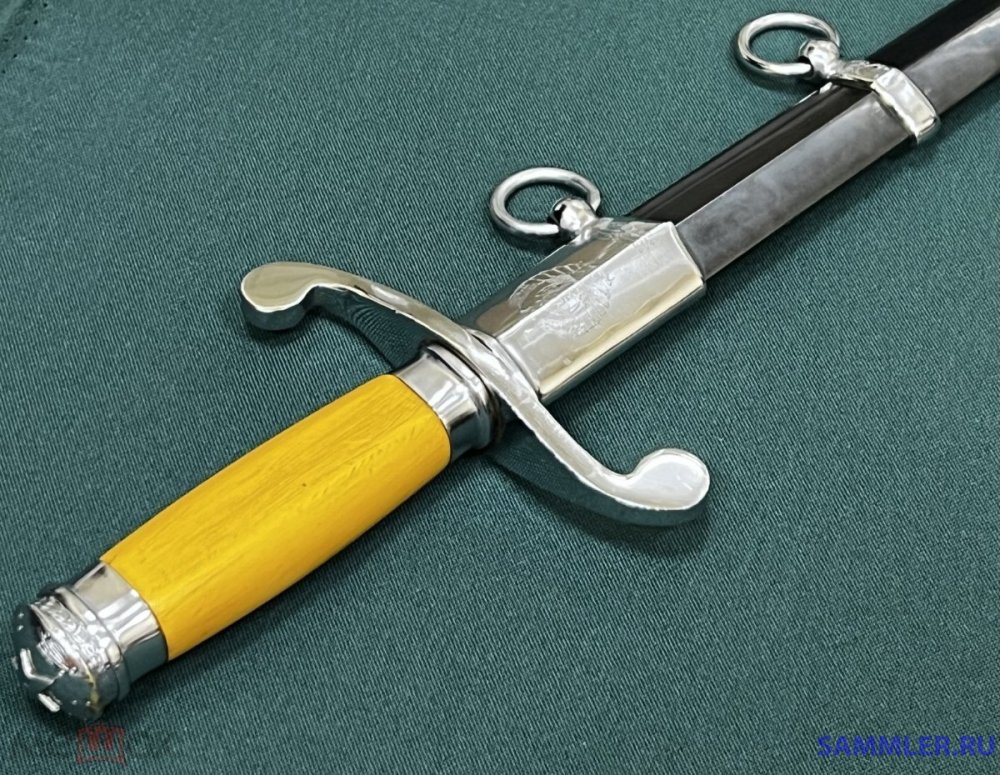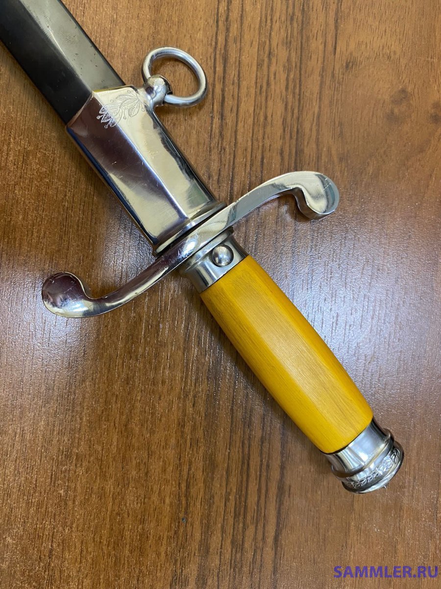 Получил долгожданную посылку. Порадовало состояние предмета, отсутствие люфтов в ручке и как сидит в ножне. Немного обещанных фото. Ножны покрашены поверх дерева и на краске стоит клеймо. Появилось два вопроса. Зачем покрашены или чем-то покрыты латунные приборы ножны? Что за клеймо "29" на кольце ножны?